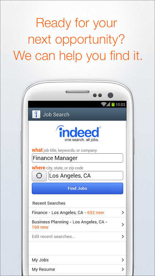 Find a job that matches your request. Jobs in ca, ny, nj, tx, fl, il, pa, oh, ga, mi, nc. Now you can easily search for jobs without having to sit at your computer. The indeed job search app can save listings you like and there are some jobs that you can apply for right on the phone. The app tracks jobs you've applied for.